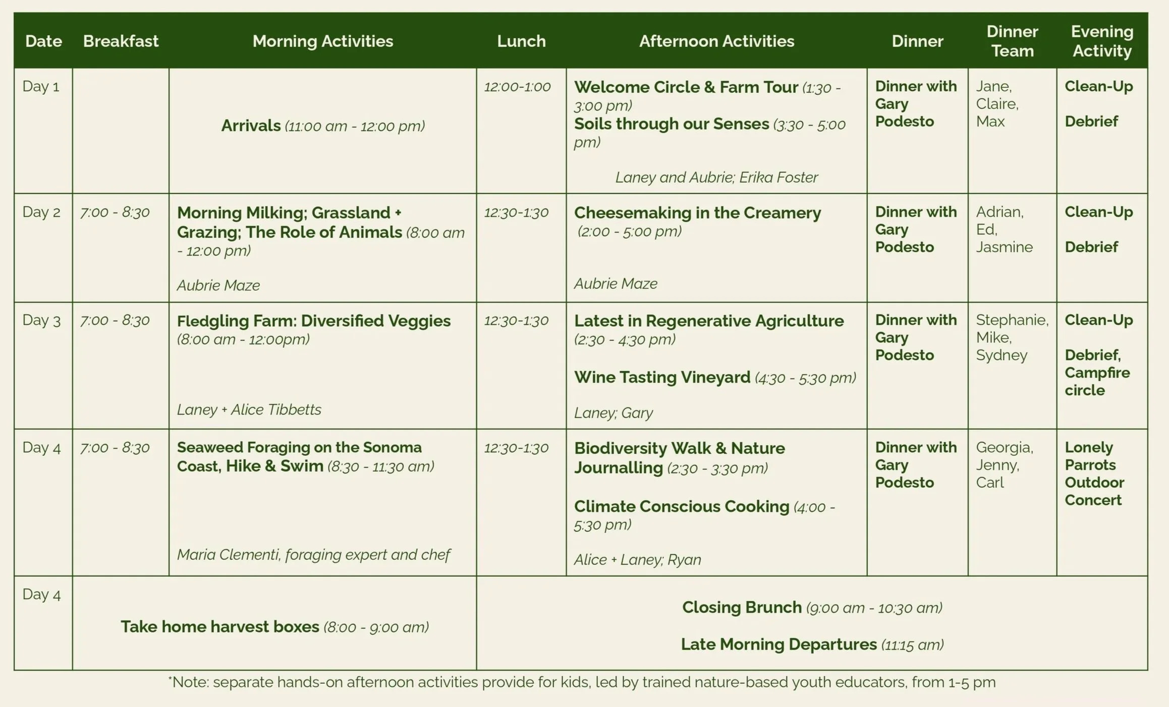 Our on-farm learning retreat for families offers an immersive, hands-on experience that blends relaxation, incredible food, education, and connection with nature. Over four days, families can stay on a working farm and take part in activities like planting seeds, feeding animals, harvesting produce, and cooking farm-to-table meals together alongside our resident chef. Guided workshops teach sustainable farming, composting, and mindfulness in nature, while evening campfires and sharing foster togetherness and reflection. Designed for all ages, the retreat encourages teamwork, curiosity, and a deeper appreciation for where food comes from—creating lasting memories and inspiring more sustainable living at home.