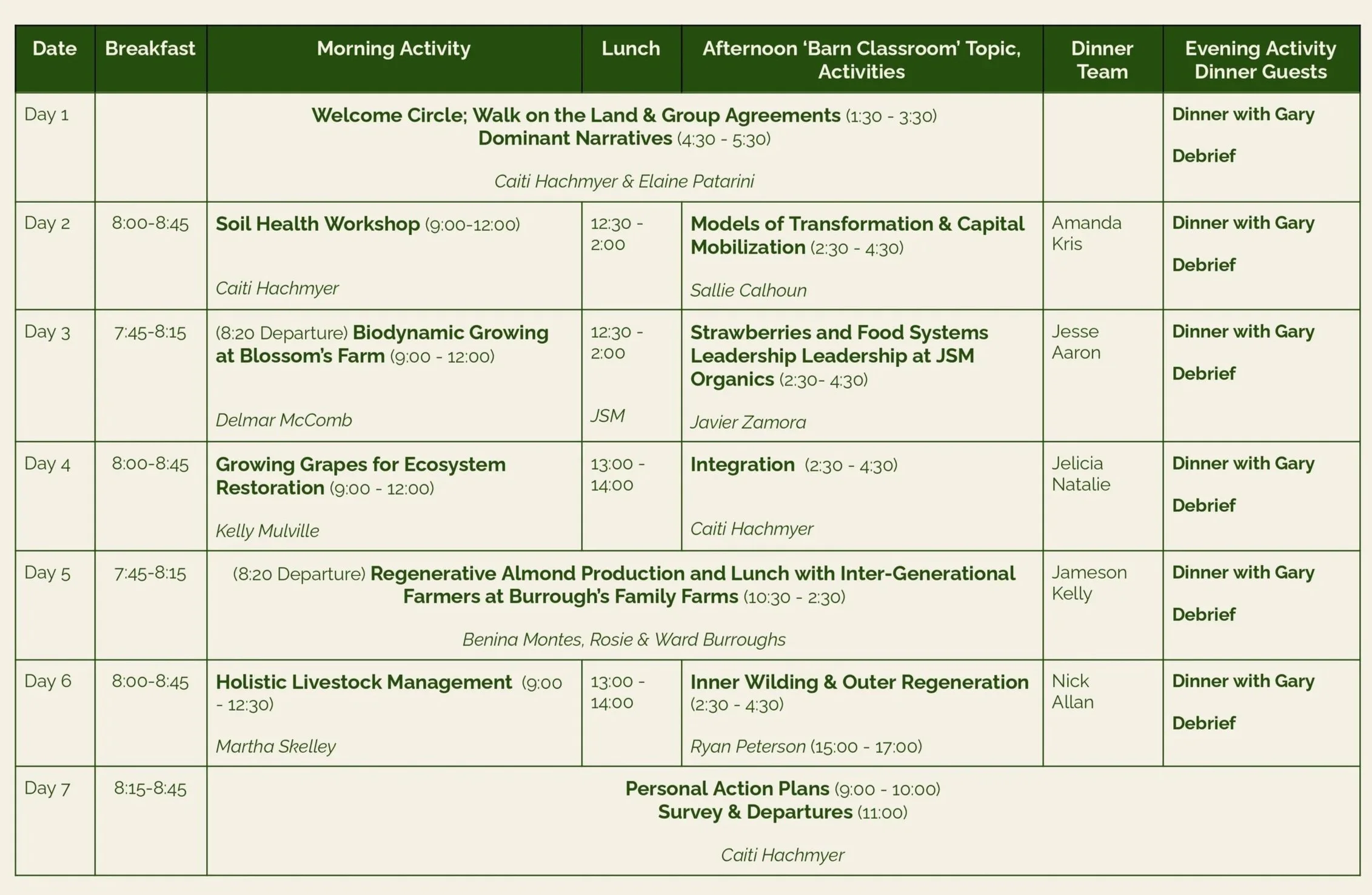 Paicines Ranch is owned by Sallie Calhoun, an impact investor, activist, and philanthropic funder in regenerative agriculture. Her work focuses on improving the health of agricultural soils and sequestering carbon in soil to mitigate climate change, while creating healthier people. She is also the founder of the No Regrets Initiative, which seeks to use all available forms of capital to create change in the agricultural system. Participants will also interact directly with Kelly Mulville (Vineyard Manager), Elaine Patarini (Learning Center) and Martha Skelley (Livestock Manager).